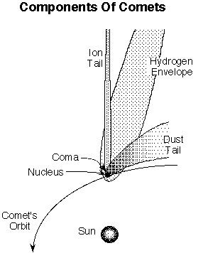 Comets are small, fragile, irregularly shaped bodies composed of a mixture of non-volatile grains and frozen gases. They have highly elliptical orbits that bring them very close to the Sun and swing them deeply into space, often beyond the orbit of Pluto.