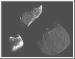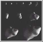 Gaspra spins once in roughly 7 hours, so these images capture almost one full rotation of the asteroid. Gaspra spins counterclockwise; its north pole is to the upper left, and the "nose" which points upward in the first image, is seen rotating back into shadow, emerging at lower left, and rotating to upper right. (Courtesy NASA/JPL)