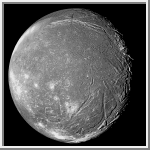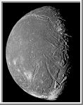 Ariel [AIR-ee-al] is a relatively small satellite and is the brightest moon of Uranus. The surface is pock-marked with craters, but the most outstanding features are long rift valleys stretching across the entire surface. Canyons much like the ones on Mars appear in the pictures. The canyon floors appear as though they have been smoothed by a fluid. The fluid could not have been water because water acts like steel at these temperatures. The flow marks might have been made by ammonia, methane or even carbon monoxide.