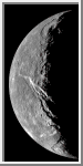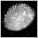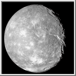 Titania [Ty-TAY-ne-ah] is the largest moon of Uranus. It is marked by a few large impact basins, but is generally covered with small craters and very rough rocks. The above image shows a 1,600 kilometer (1,000 mile) long trench. A large double walled crater can be seen towards the top of the image. There are many faults on Titania indicating there has been internal forces molding its surface.