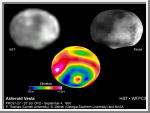 The picture in the center is a color-encoded elevation map of Vesta which clearly shows the giant 285-mile diameter impact basin and "bull's-eye" central peak. The map was constructed from 78 Wide Field Planetary Camera 2 pictures. Surface topography was estimated by noting irregularities along the limb and at the terminator (day/night boundary) where shadows are enhanced by the low Sun angle.